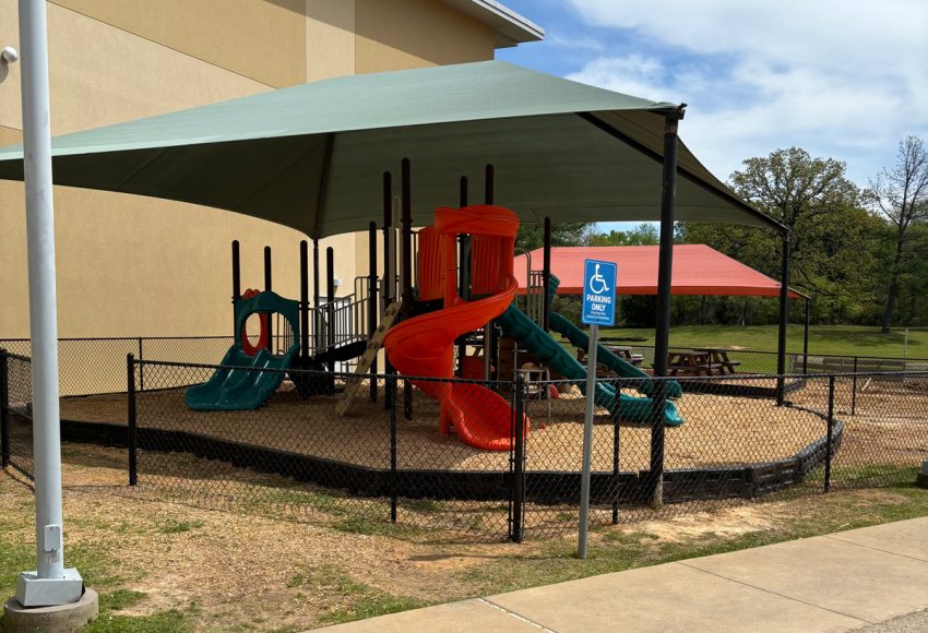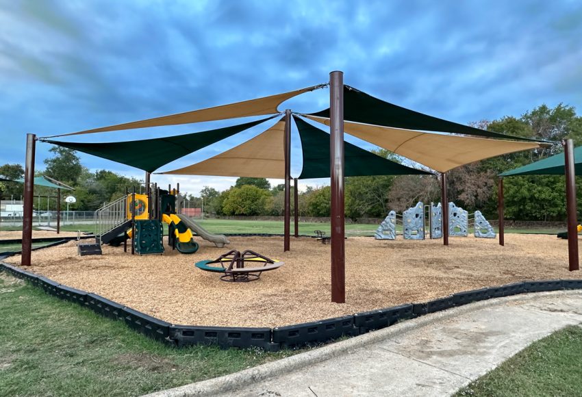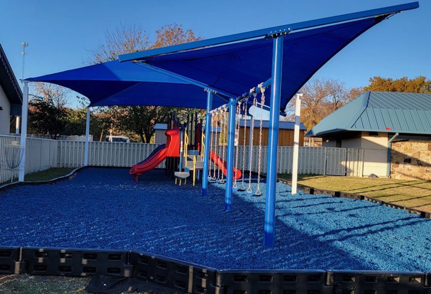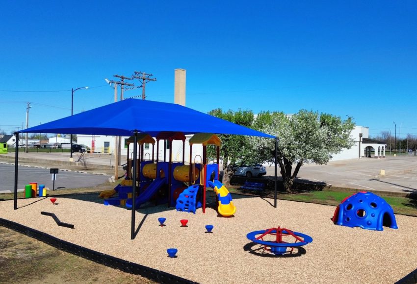 Customer: Chickasaw NationProject: C.N. Youth CenterLocation: Tishomingo, OK2-Bay Swing w/Ribbon shade28’x34’ Hip Shade w/10’ entry height(18,000lbs) Loose Fill Rubber Mulch