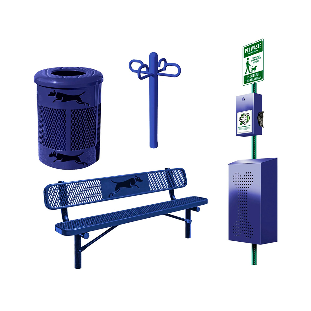 A Leash Post provides a designated area for visitors to hang their leashes while their dogs roam freely. A Trash Receptacle ensures a tidy environment by providing a convenient disposal solution for drink bottles, snack wrappers, and more. The 6_ Bench offers sturdy and versatile seating, allowing guests to unwind and socialize while observing their furry friends in action. Additionally, the Pet Waste Station encourages cleanliness and responsibility with its bag dispenser, high-visibility sign, and trash can, ensuring no pet waste is left behind.