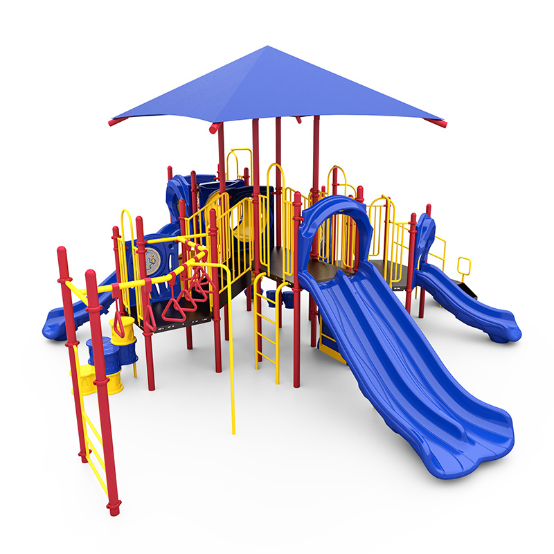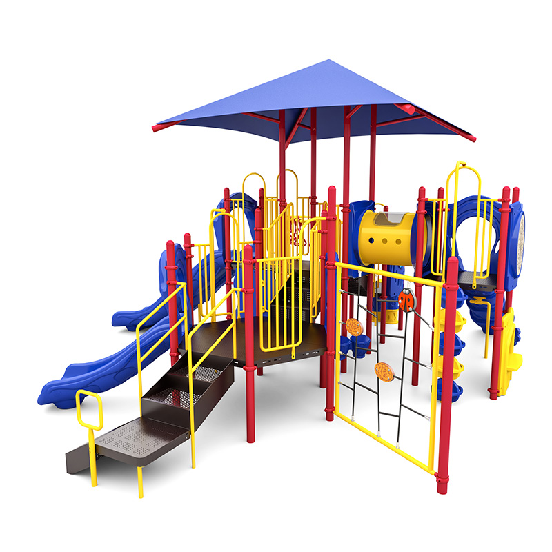 This high-energy playground unit is packed with exciting slides, challenging climbers, and interactive features that promote physical, sensory, and social play. It includes a thrilling 5ft double slide, a 5ft sectional slide, and a 3ft single slide for a variety of sliding experiences. Children can build strength and coordination on the 5ft straight rung climber, 5ft PE vertical climber, 5ft pod climber, net climber ladder, 3ft trunk climber, and 3ft wing climber. Overhead swinging rings add an upper-body challenge, while sensory play is enriched through the maze panel, rain wheel, beads & cups panel, gears panel (above), counter panel (below), and rhythmic bongo drums. The ADA 3ft transfer station ensures inclusive access, making this playground perfect for parks, schools, and community spaces focused on active, inclusive, and imaginative play.